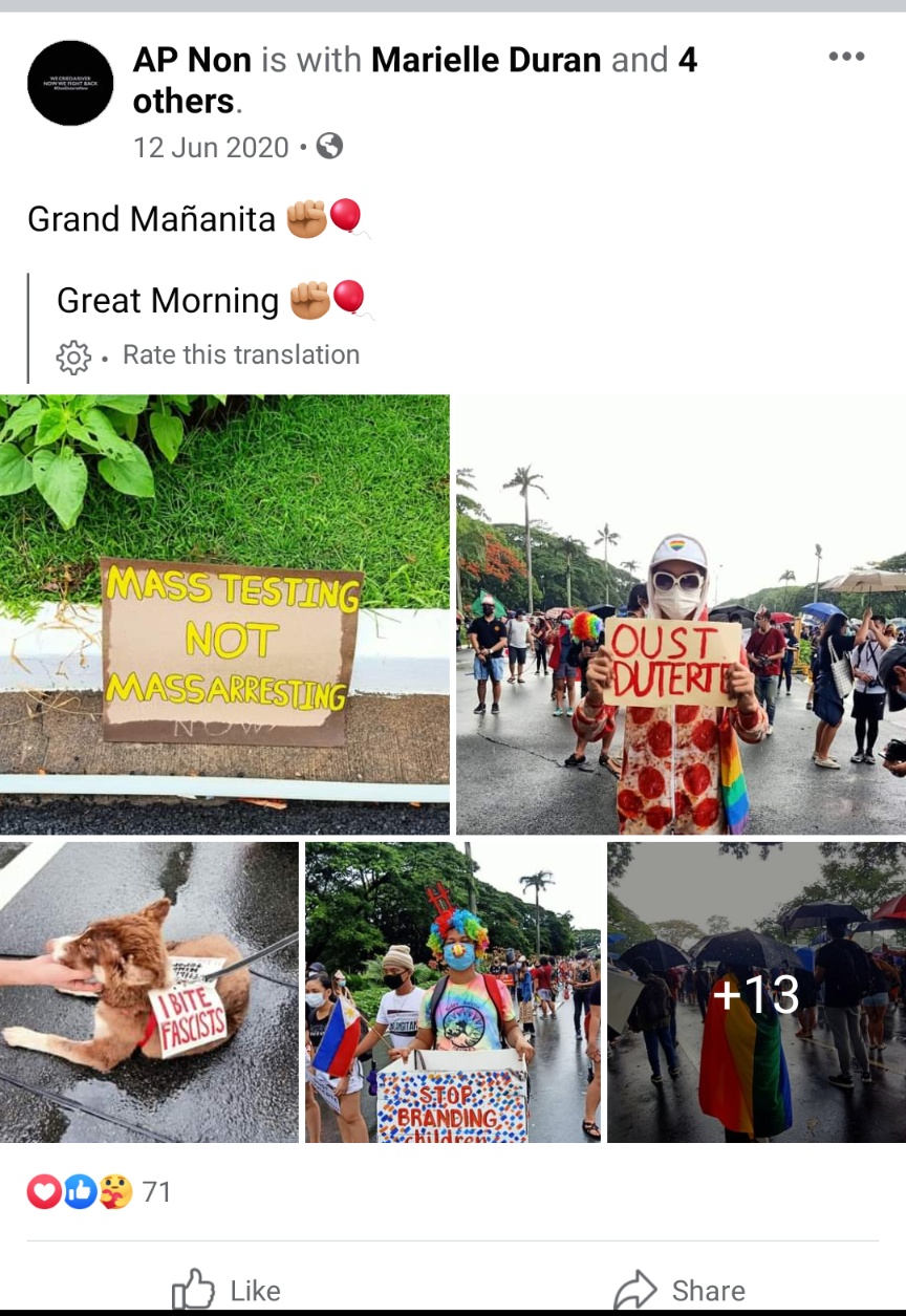 It is on this profile that Non seemingly announced her decision to shut down her community pantry in a post dated yesterday, the 21st April. Among other events documented on her timeline is her participation in the “Grand Mananita” rally held in the Diliman Campus of the University of the Philippines (UP) in June last year.